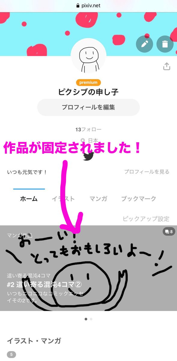 Pixiv Pixiv豆知識 ピックアップ 機能を知ってますか プロフィール画面に 自分のおすすめ作品を固定できちゃうんです 自分のページに来てくれた人には 自信作を見て欲しいですよね イベント時期はお品書きを固定しておくのもいいかも 自分